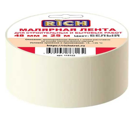Малярная клейкая лента на бумажной основе находит широкое применение при проведении штукатурных и лакокрасочных работ, а также используется в быту для заклейки окон. Изготовлена из крепированной бумаги белого цвета. Малярная клейкая лента легко удаляется с поверхности, не оставляя следов. На поверхности ленты можно делать надписи. Легко отрывается без использования ножниц. Малярная лента влагостойкая, обеспечивает отличную адгезию с разными типами поверхности.