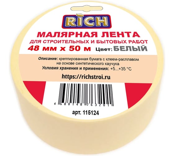 Малярная клейкая лента на бумажной основе находит широкое применение при проведении штукатурных и лакокрасочных работ, а также используется в быту для заклейки окон. Изготовлена из крепированной бумаги белого цвета. Малярная клейкая лента легко удаляется с поверхности, не оставляя следов. На поверхности ленты можно делать надписи. Легко отрывается без использования ножниц. Малярная лента влагостойкая, обеспечивает отличную адгезию с разными типами поверхности.